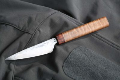 This is a small piece I did as practice hammer-shaping wrought iron san mai. It’s wrought iron on either side of 1095, with a redwood burl and maple handle. Nothing fancy, but the texturing in the wrought iron makes me very happy; the knife looks rough but feels smooth.