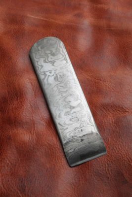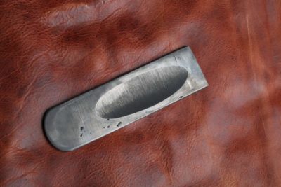 The hand-hold is deliberately rough to make it easier to grip. The metal is not etched; it’s just how the 1095/wrought comes out when you get high layer on it.