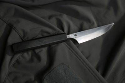 Blade is 1095 core with cable damascus facings. Handle is ebony collar with bog oak.