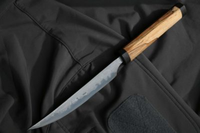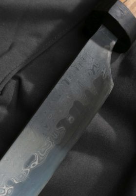 Blade is high layer-count 1095/wrought iron (about 110 layers) on the faces of 1095 core, polished to near mirror then cold parkerized in phosphoric acid and manganese dioxide.
