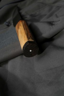 Handle is resin-soaked spalted maple with bog oak bolsters. Rear bolster has a silver pin in it.