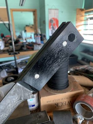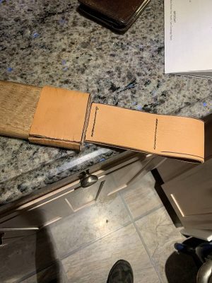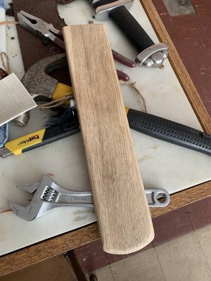 Home2023April11Parang Builds, Finished Works, From the "Fucked Box" Parang April 11, 2023 mjr Complete handle glue-up leather cut for hanger quarter sawn oak! yum! hanger sewn and glued Finished!